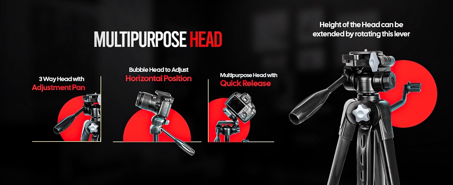 Product Features 3-Way Pan Head with Bubble Level, Foldable, Lightweight, Slip Resistant, Universal Compatibility